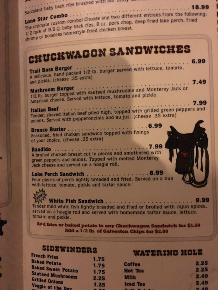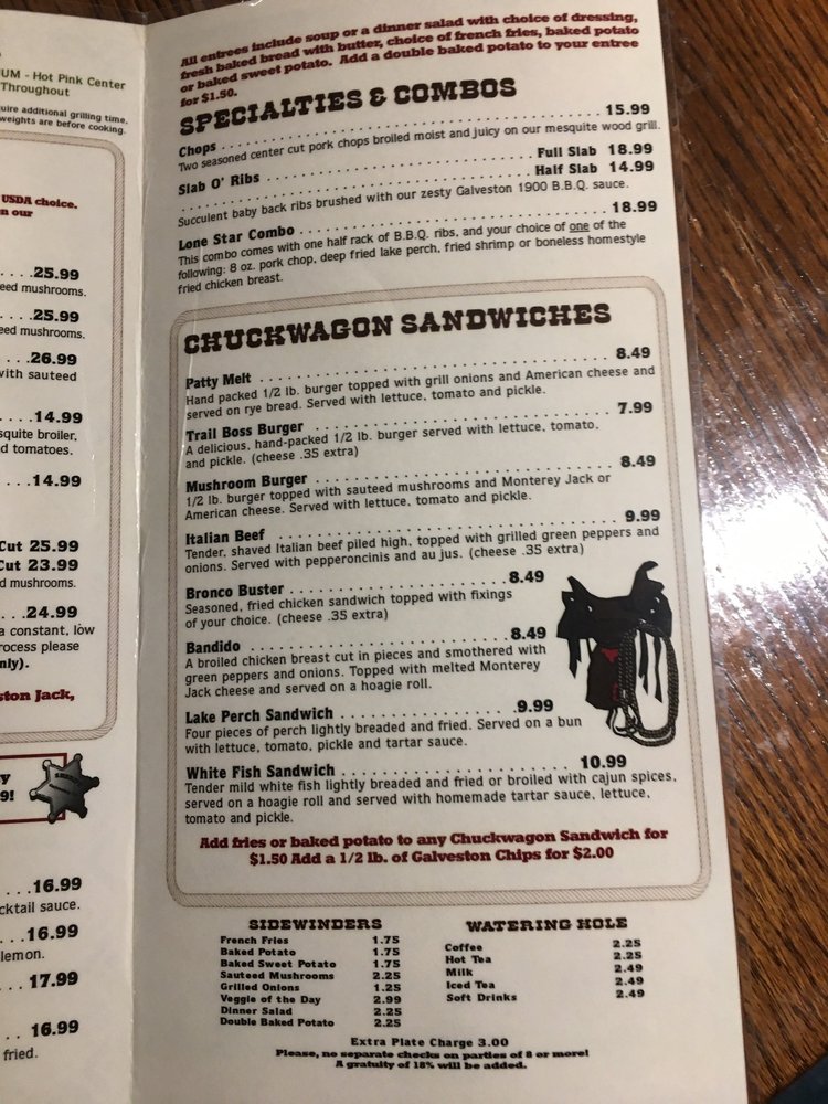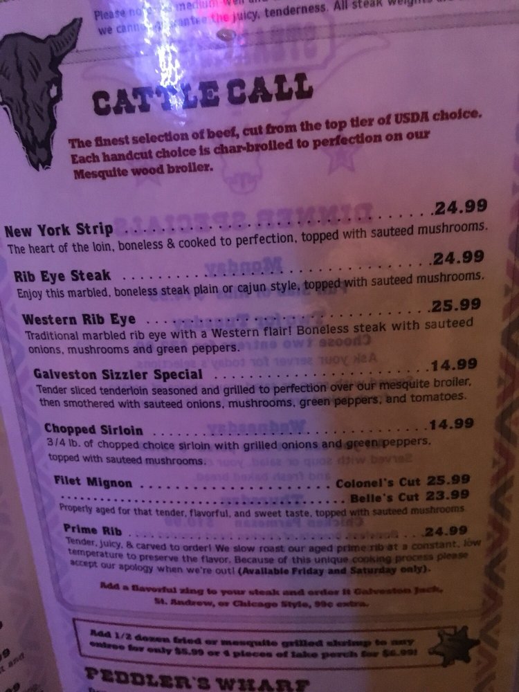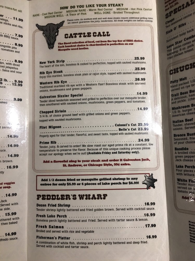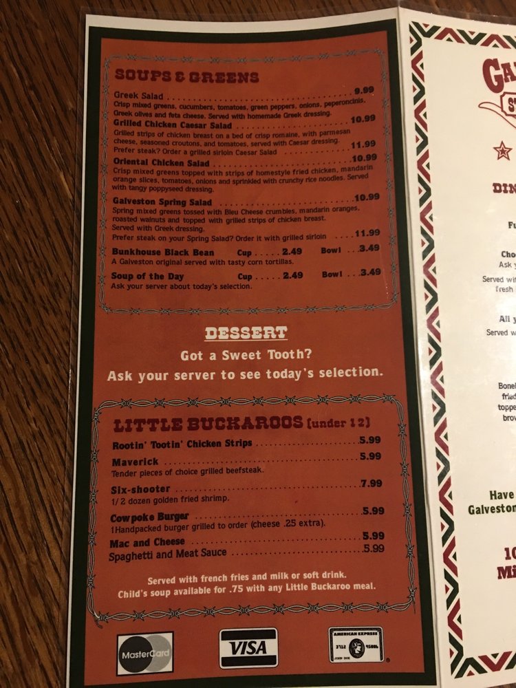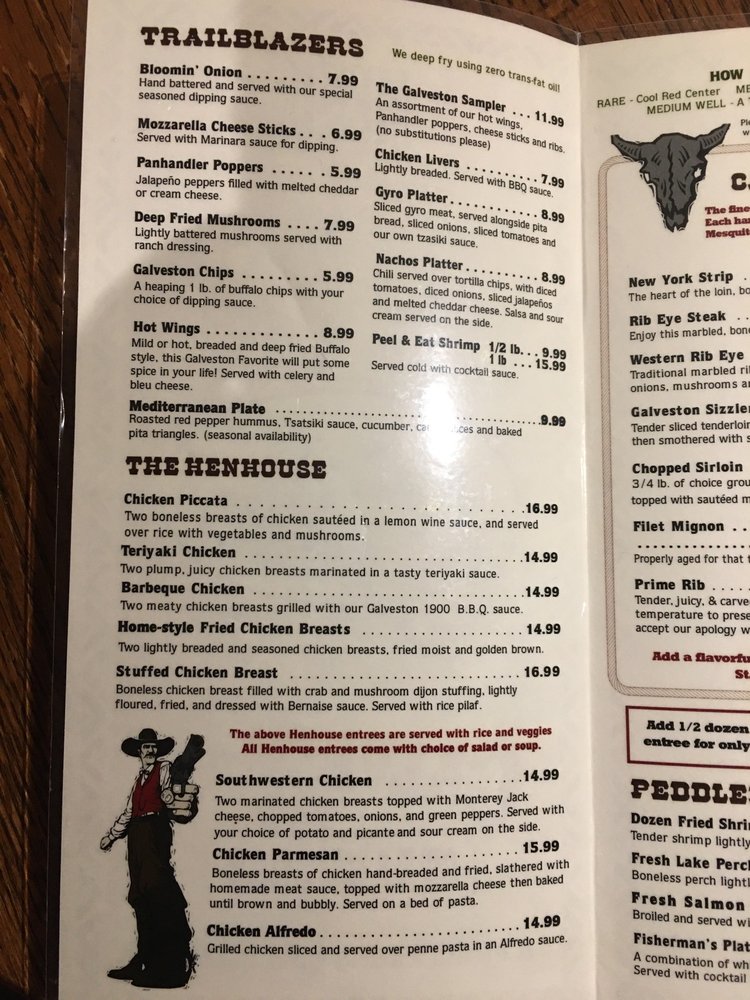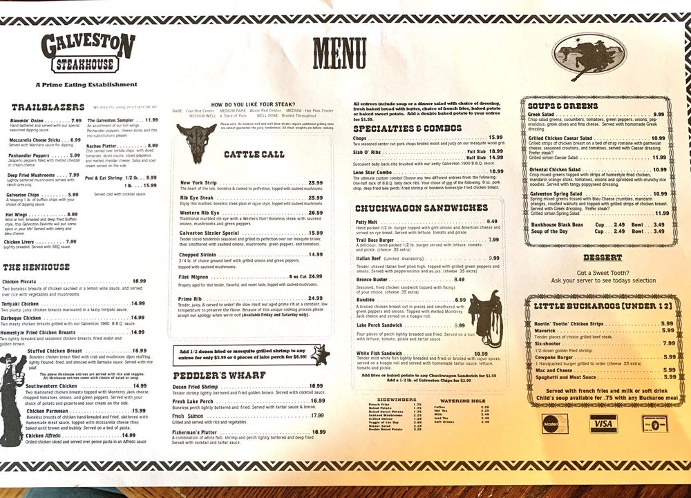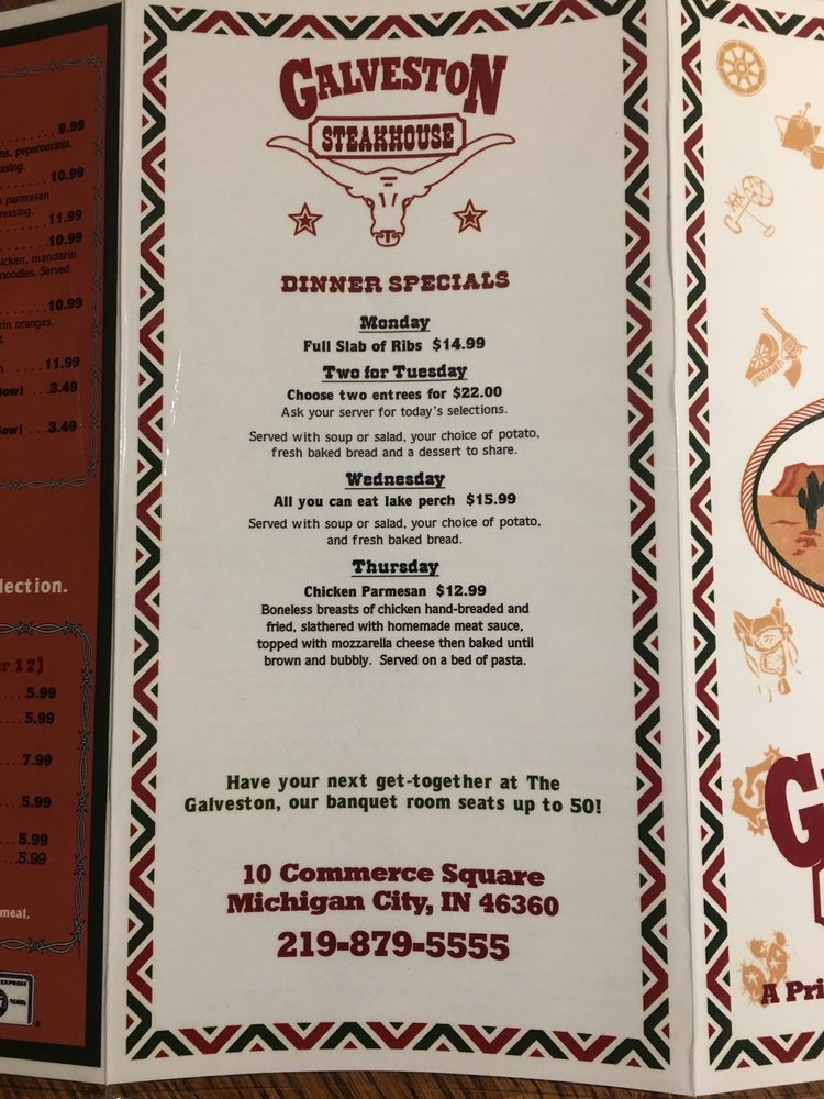 Galveston Steakhouse in Michigan City offers a diverse menu in a casual, Western-style setting. Known for their perfectly cooked steaks, like the New York Strip and Rib Eye, each charbroiled to perfection on a mesquite wood broiler. Don't miss their Trailblazers appetizers, such as the Bloomin' Onion and Mozzarella Cheese Sticks. Customers rave about the flavorful Porterhouse steak and the crispy Brussels sprouts as standout dishes. The ambiance at Galveston Steakhouse is described as Texas Saloon-style, adding to the dining experience. With attentive service and consistently high-quality dishes, Galveston's is a top choice for a steakhouse experience in Michigan City.